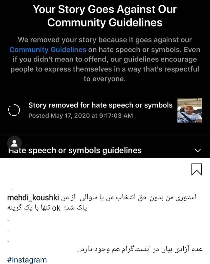 اما موضوع دیگری که مورد بحث در شبکههای اجتماعی قرار گرفته، این است که آیا حذف پست مهدی کوشکی آنگونه که خود او میگوید اقدامی خلاف آزادی بیان بوده است؟ تعداد اندکی از کاربران از اقدام اینستاگرام انتقاد کردهاند و میگویند حذف پست کوشکی نقض آزادی بیان است. برخی دیگر هم میگویند این کار نه تنها هیچ فایدهای ندارد بلکه تبعات منفی دیگری را هم در پی خواهد داشت.