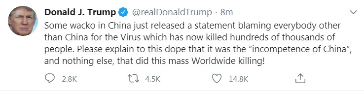 رئیسجمهور آمریکا در پیامی نوشت: «چند دیوانه در چین بیانیهای منتشر کردند که همه را به غیر از چین بابت شیوع کرونا که تا حالا موجب کشته شدن صدها هزار نفر شده مقصر قلمداد میکند. لطفا برای این احمقها توضیح بدهید "بیکفایتی چین" بوده که موجب این کشتار جمعی در سراسر جهان شده و نه چیز دیگری.»