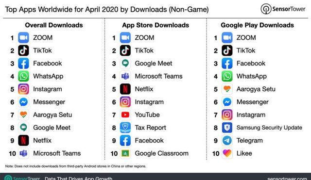 به گزارش سایت طلا ،بر اساس تازه ترین آمار و گزارش های منتشر شده، کارشناسان و محققان فعال در موسسه تحقیقاتی سنسور تاور به معرفی برترین اپلیکیشن های دانلود شده توسط کاربران موبایل در سراسر جهان در ماه گذشته میلادی، آوریل ۲۰۲۰، پرداخته اند که در این میان اپلیکیشن زوم (Zoom) موفق شده است رتبه نخست این رده بندی را به خود اختصاص دهد. بعد از آن نیز اپلیکیشن تیک تاک (TikTok)، فیس بوک، واتس اپ و اینستاگرام توانسته اند در رتبه های دوم تا چهارم پردانلود ترین و محبوب ترین برنامه های موجود در فروشگاههای آنلاین و اینترنتی بایستند.