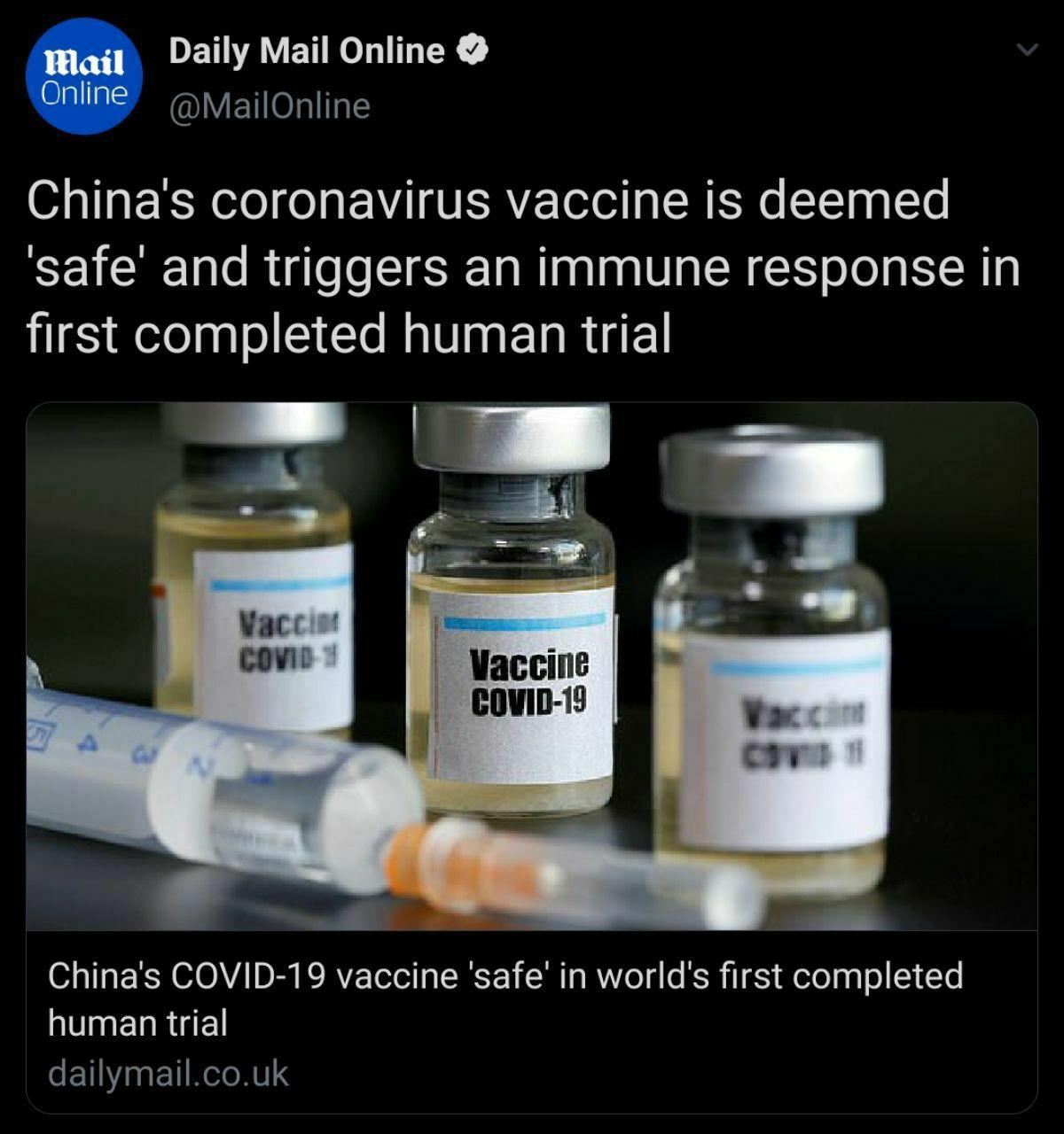 اولین واکسن ایمن ضدکرونای چین آزمایشات انسانی خود را با موفقیت تکمیل کرد. این واکسن روی ۱۰۸ نفر آزمایش شد و هیچ کدام عوارض منفی از خود بروز ندادند.