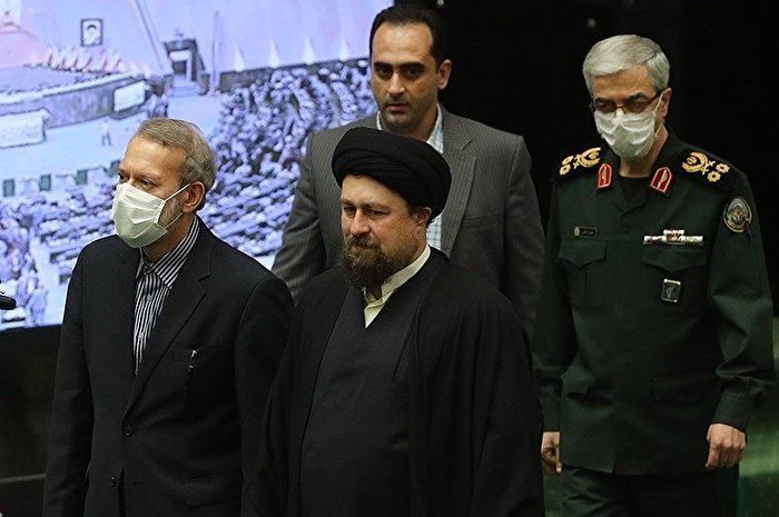 حجتالاسلام حسن روحانی رئیسجمهور، حجتالاسلام ابراهیم رئیسی، حجت الاسلام محمدی گلپایگانی، عبدالرضا رحمانیفضلی وزیر کشور، امیر سرلشکر سید عبدالرحیم موسوی فرمانده کل ارتش جمهوری اسلامی ایران، عباسعلی کدخدایی، عادل آذر رئیس دیوان محاسبات، عبدالعلی علی عسکری رئیس صدا و سیمای جمهوری اسلامی ایران، حسین امیرعبداللهیان، حجتالاسلام سید حسن خمینی، علی لاریجانی رئیس مجلس دهم، سرلشکر باقری و حداد عادل امروز میهمان پارلمان بودند.