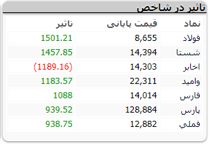در این بازار، فولاد مبارکه اصفهان گروه مدیریت سرمایه گذاری امید، صنایع پتروشیمی خلیج فارس، پتروشیمی پارس، ملی صنایع مس ایران و بانک ملت نسبت به سایر نمادها بیشترین تاثیر مثبت و در مقابل مخابرات ایران نسبت به سایر نمادها بیشترین تاثیر منفی را روی بورس گذاشتند.