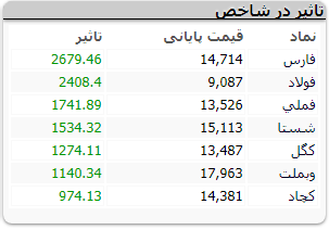 سنگآهن گوهر زمین، پتروشیمی مارون، هلدینگ صنایع معدنی خاورمیانه، سهامی ذوبآهن اصفهان، سرمایهگذاری صبا تامین، پتروشیمی زاگرس و پتروشیمی تندگویان نسبت به سایر نمادها بیشترین تاثیر مثبت را روی فرابورس داشتند.