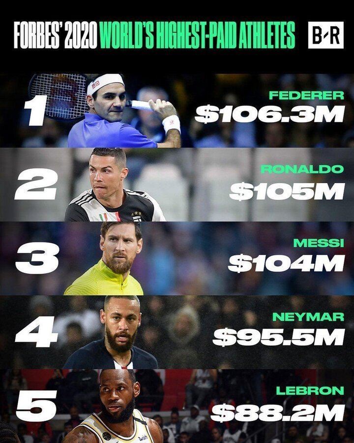 مجله فوربس فهرست پردرآمدترین ورزشکاران دنیا در سال 2020 را منتشر کرده که بر خلاف سالهای گذشته مسی و رونالدو در صدر قرار ندارند