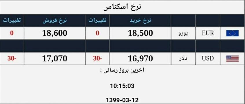 نرخ ارز در صرافی ملی نسبت به دیروز کاهش داشت و قیمت دلار به 17070 تومان رسید. آخرین نرخ ارز در سامانه نیما مربوط به ۱۱ خرداد ماه است که بر این اساس قیمت دلار نیمایی افزایش یافت و نرخ فروش دلار ۱۶ هزار و ۵۱۴ تومان و نرخ خرید دلار ۱۶ هزار و ۲۰۲ تومان اعلام شد.بانک مرکزی نیز نرخ ۴۷ ارز را اعلام کرد که بر اساس آن نرخ چهار ارز کاهش و قیمت ۳۲ واحد پولی دیگر افزایش یافت؛ نرخ بقیه ارزها نیز ثابت ماند.