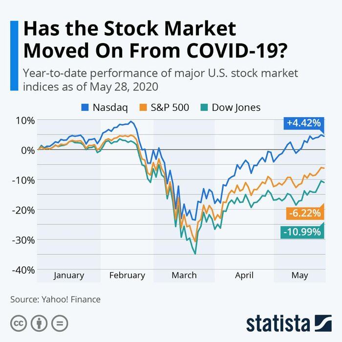 پایگاهدادهپردازی استاتیستا نیز این تغییرات را به معنای عبور بازارها از ویروس کرونا تفسیر میکند. نمودار زیر، روند ماههای اخیر شاخصهای اصلی بورس آمریکا را نشان میدهد که بعد از سقوطی سهمگین، کم کم به مدار رشد بازگشتهاند.