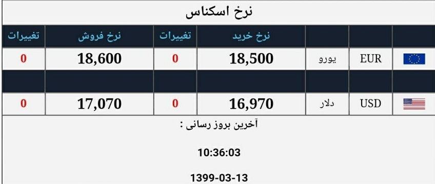 همچنین هر فرانک سوئیس ۴۳ هزار و ۶۸۵ ریال، کرون سوئد ۴ هزار و ۴۸۱ ریال، کرون نروژ ۴ هزار و ۳۵۷ ریال، کرون دانمارک ۶ هزار و ۲۶۹ ریال، روپیه هند ۵۵۶ ریال، درهم امارات متحده عربی ۱۱ هزار و ۴۳۷ ریال، دینار کویت ۱۳۶ هزار و ۳۲۱ ریال، یکصد روپیه پاکستان ۲۵ هزار و ۶۶۸ ریال، یکصد ین ژاپن ۳۸ هزار و ۹۹۹ ریال، دلار هنگ کنگ ۵ هزار و ۴۱۹ ریال، ریال عمان ۱۰۹ هزار و ۲۳۳ ریال و دلار کانادا ۳۰ هزار و ۹۶۴ ریال قیمت خورد.