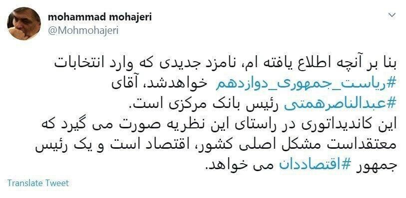 محمد مهاجری فعال سیاسی و رسانه ای اصولگرا، در توئیتی نوشت: بنا برآنچه اطلاع یافته ام، نامزد جدیدی که وارد انتخابات ریاست جمهوری سیزدهم خواهدشد، آقای عبدالناصرهمتی رئیس بانک مرکزی است. این کاندیداتوری در راستای این نظریه صورت می گیرد که معتقد است مشکل اصلی کشور، اقتصاد است و یک رییس جمهور اقتصاددان می خواهد.