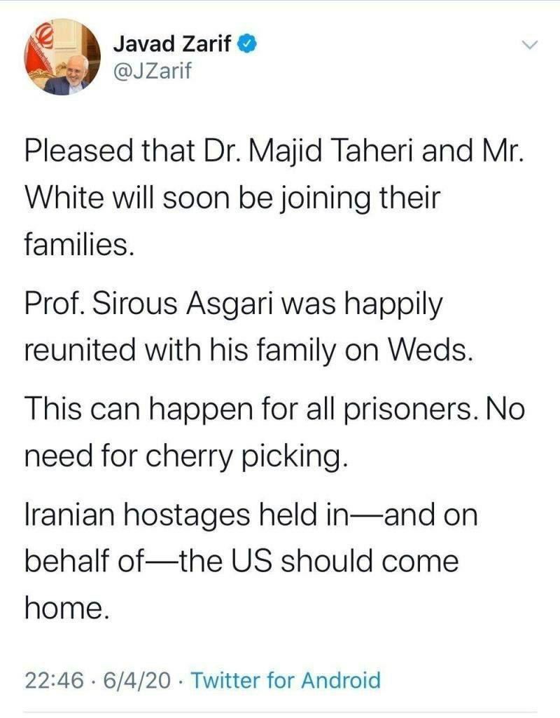 محمدجواد ظریف در این پیام توئیتری اعلام کرد: «خوشحالم که دکتر مجید طاهری و آقای وایت بهزودی به آغوش خانوادههای خود بازخواهند گشت. خوشبختانه پروفسور سیروس عسگری نیز روز چهارشنبه به جمع خانوادهاش بازگشت. این اتفاق میتواند برای همه زندانیها رخ دهد. نیازی به دستچین کردن نیست.»