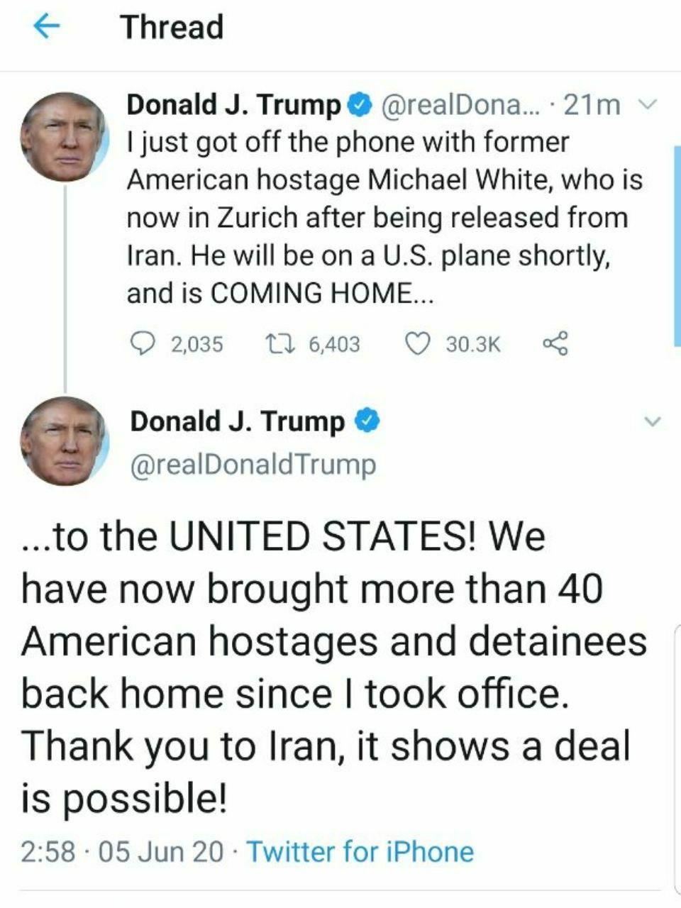 رئیس‌جمهور آمریکا ضمن تشکر از ایران تصریح کرد: پس از به قدرت رسیدن من، بیش از 40 زندانی و گروگان به خانه بازگردانده شدند که این نشان می‌دهد توافق ممکن است.