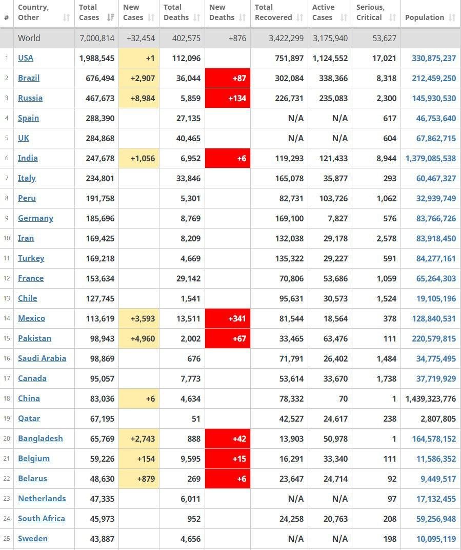 بر اساس آمار وبگاه worldometers شمار مبتلایان به «کووید۱۹» در جهان از هفت میلیون نفر عبور کرده است.