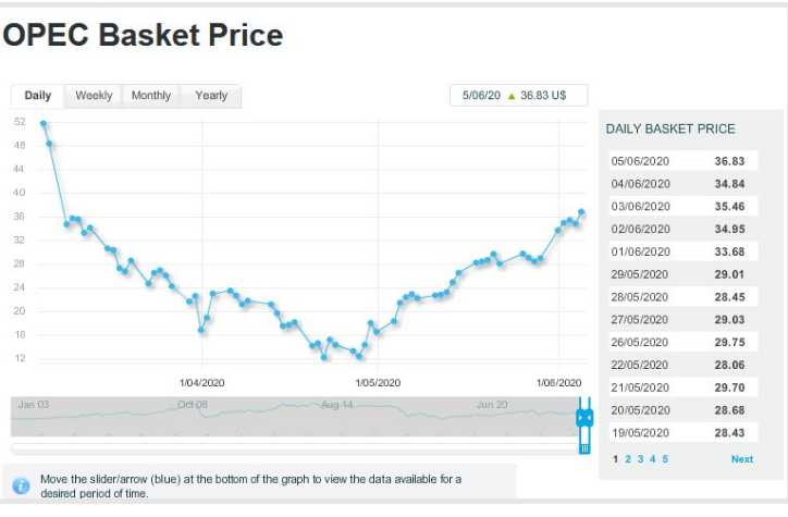 اوپک در آخرین بهروز رسانی سایت خود اعلام کرد، هر بشکه سبد نفتی اوپک روز جمعه (16 خرداد) با یک دلار و 99 سنت افزایش 36.83 دلار فروخته شده است. این قیمت، بالاترین رقم از 16 ماه مارس (تقریبا 3 ماه گذشته) محسوب میشود.