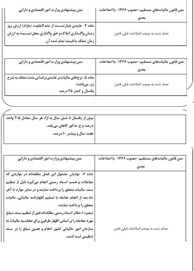 بر اساس متن پیشنهادی وزارت اقتصاد برای لایحه اصلاح مالیاتهای مستقیم، نرخ مالیات بر عایدی بر اساس مدت تملک یک سال و کمتر 25 درصد و بیش از یک سال تا شش سال بهازای هر سال 2.5 واحد درصد از نرخ مذکور کاهش خواهد یافت، همچنین برای معاملات هفت سال و بیشتر نرخ مذکور 10 درصد لحاظ شده است.