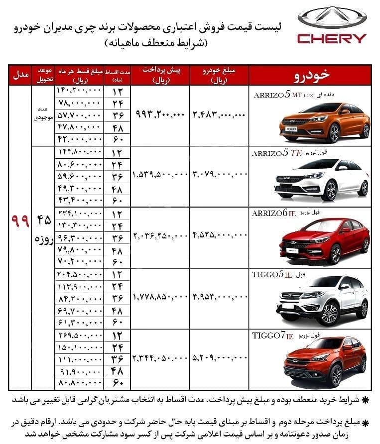 براساس بخشنامه جدید این شرکت، ۵ محصول چری با اقساط ۱۲ تا ۶۰ ماهه با موعد تحویل ۴۵ روزه، آماده واگذاری به متقاضیان می‌باشند.