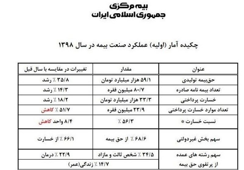 در سال 1398، سه رشته بیمهای درمان، حوادث راننده و شخص ثالث- مازاد (به ترتیب با 73.9، 73.1 و 67.4 درصد) نسبت خسارتی بالاتر از بازار بیمه داشتند. بر اساس این گزارش، در سال گذشته حدود 80.7 میلیون بیمه نامه صادر و حدود 23.9 میلیون فقره خسارت پرداخت شده است که نسبت به سال گذشته به ترتیب 14.3 درصد افزایش و 51.7 درصد کاهش داشته است. شایان ذکر است، کاهش در تعداد موارد خسارت پرداختی به دلیل کاهش (55.3 درصدی) این تعداد در بیمه درمان با سهم عمده (87.1 درصدی) از تعداد خسارتهای پرداختی بازار بیمه بوده است.