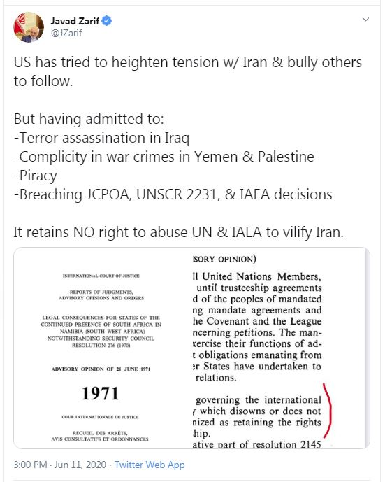 به گزارش فارس، ظریف در صفحه توئیتر خود با به اشتراک گذاشتن تصویری از متن نظر مشورتی دیوان بینالمللی دادگستری در سال ۱۹۷۱ ( مورد نامیبیا ) به عنوان یکی از مبانی حقوقی برای مخالفت با ادعای واهی دولت ایالات متحده برای بازگرداندن تحریمها علیه ایران، نوشت: «آمریکا تلاش کرده است تا تنش با ایران را افزایش دهد و با قلدری، دیگران را به تبعیت از خود وادارد».