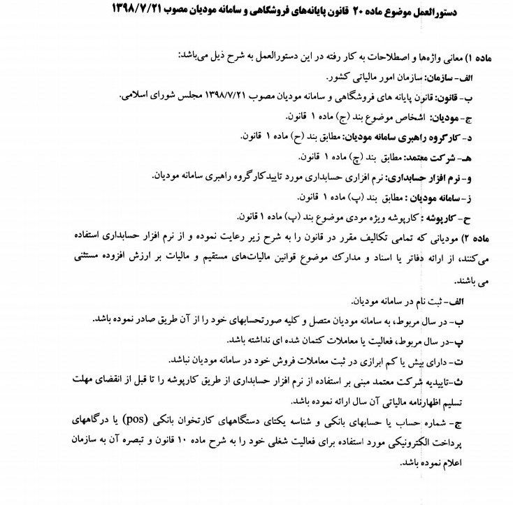 دستور العمل ماده ۲۰ قانون پایانه های فروشگاهی و سامانه مودیان از سوی وزیر اقتصاد ابلاغ شد.