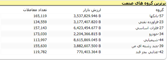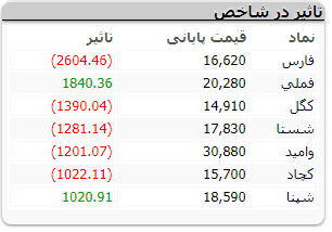 همچنین نماد سهامی ذوب آهن اصفهان (ذوب)، پتروشیمی تندگویان (شگویا)، تولید نیروی برق دماوند (دماوند)، فرابورس ایران (فرابورس)، سرمایه گذاری صبا تامین (صبا)، مدیریت انرژی تابان هور (وهور)، توسعه مولد نیروگاهی جهرم (بجهرم) با تاثیر منفی بر شاخص این بازار همراه بودند.