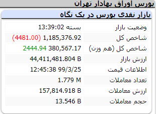 به گزارش سایت طلا ، شاخص کل بورس اوراق بهادار تهران در پایان معاملات امروز یکشنبه با کاهش 4481 واحد روبهرو شد و به رقم یک میلیون و 185 هزار و 376 واحد رسید.