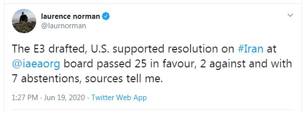 «لارنس نورمن» خبرنگار نشریه «والاستریتژورنال» به نقل از دیپلماتهای حاضر در نشست حضوری شورای حکام گزارش داد: «این قطعنامه تصویب شد. اعضای شورای حکام آژانس اتمی از ایران به دلیل عدم همکاری با تحقیقات آژانس انتقاد کردند. این اولین قطعنامه علیه ایران از سال ۲۰۱۲ است».