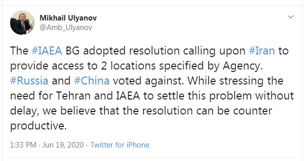 «میخائیل اولیانوف» نماینده روسیه در سازمانهای بینالمللی با بیان اینکه شورای حکام با تصویب این قطعنامه از ایران خواست دسترسی به دو مکان مورد نظر را فراهم کند، گفت: «روسیه و چین [به این قطعنامه] رأی منفی دادند».
