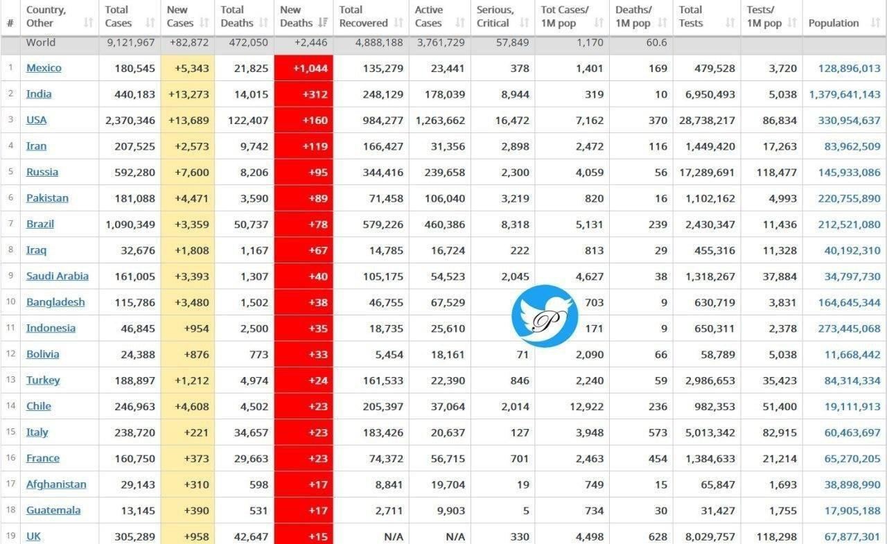 ایران چهارم جدول روزانه فوتیهای کرونا / رکورد 1044 فوتی کرونایی به نام مکزیک ثبت شد