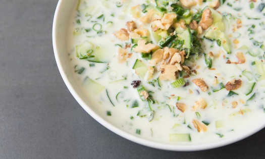 ماست و خیار سبز هر دو خواص فوق العاده زیادی دارند و به خنک ماندن بدن نیز کمک می کنند. همچنین آب موجود در این غذا نیاز بدن به آب را برطرف می سازد. افزودنی های دیگری نیز مانند گردو در این غذای فوق العاده وجود دارد که آن ها نیز سرشار از خاصیت می باشند.