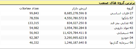 امروز نمادهای هلدینگ صنایع معدنی خاورمیانه (میدکو)، فرابورس ایران (فرابورس)، سهامی ذوب آهن اصفهان (ذوب)، سرمایه گذاری صبا تامین (صبا)، پتروشیمی زاگرس (زاگرس)، پتروشیمی تندگویان (شگویا)، فولاد هرمزگان جنوب (هرمز)، بانک دی (دی)، توسعه مولد نیروگاهی جهرم (بجهرم) و تولید نیروی برق دماوند (دماوند) تاثیر مثبت بر شاخص این بازار را داشتند.