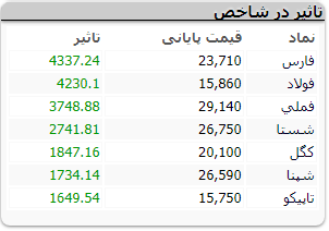 همچنین نماد دامداری تلیسه نمونه (تلیسه) و تولید برق علویه مپنا (بمپنا) با تاثیر منفی بر شاخص این بازار همراه بودند.