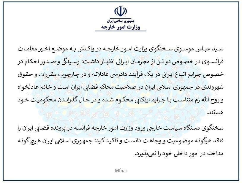 ورود وزارت خارجه فرانسه در پرونده قضایی ایران را فاقد وجاهت خواند