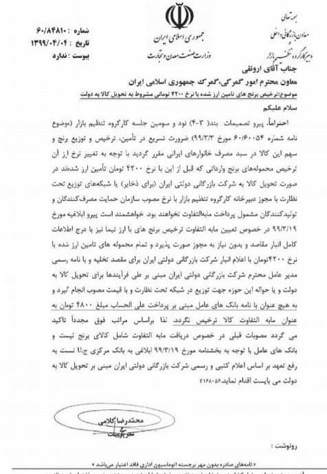 محمدرضا کلامی سرپرست معاونت بازرگانی داخلی وزارت صنعت، معدن و تجارت و دبیر کارگروه تنظیم بازار با ارسال نامه‌ای به معاون امور گمرکی گمرک جمهوری اسلامی ایران با موضوع ترخیص برنج‌های تأمین‌ارز‌شده با نرخ 4200تومانی مشروط به تحویل کالا به دولت نوشت: احتراماً پیرو تصمیمات نود و سومین جلسه کارگروه تنظیم بازار، ضرورت تسریع در تأمین ترخیص و توزیع برنج و سهم این کالا در سبد مصرفی خانوار ایرانی مقرر شد با توجه به تغییر نرخ ارز آن، ترخیص محموله‌های برنج وارداتی که قبل از این با نرخ 4200تومانی تأمین ارز شده‌اند در صورت تحویل کالا به شرکت بازرگانی دولتی ایران (برای ذخایر استراتژیک) یا به شبکه‌های توزیع تحت نظارت با مجوز دبیرخانه کارگروه تنظیم بازار با نرخ مصوب سازمان حمایت مصرف کنندگان و تولید کنندگان مشمول پرداخت مابه‌التفاوت نخواهند بود.