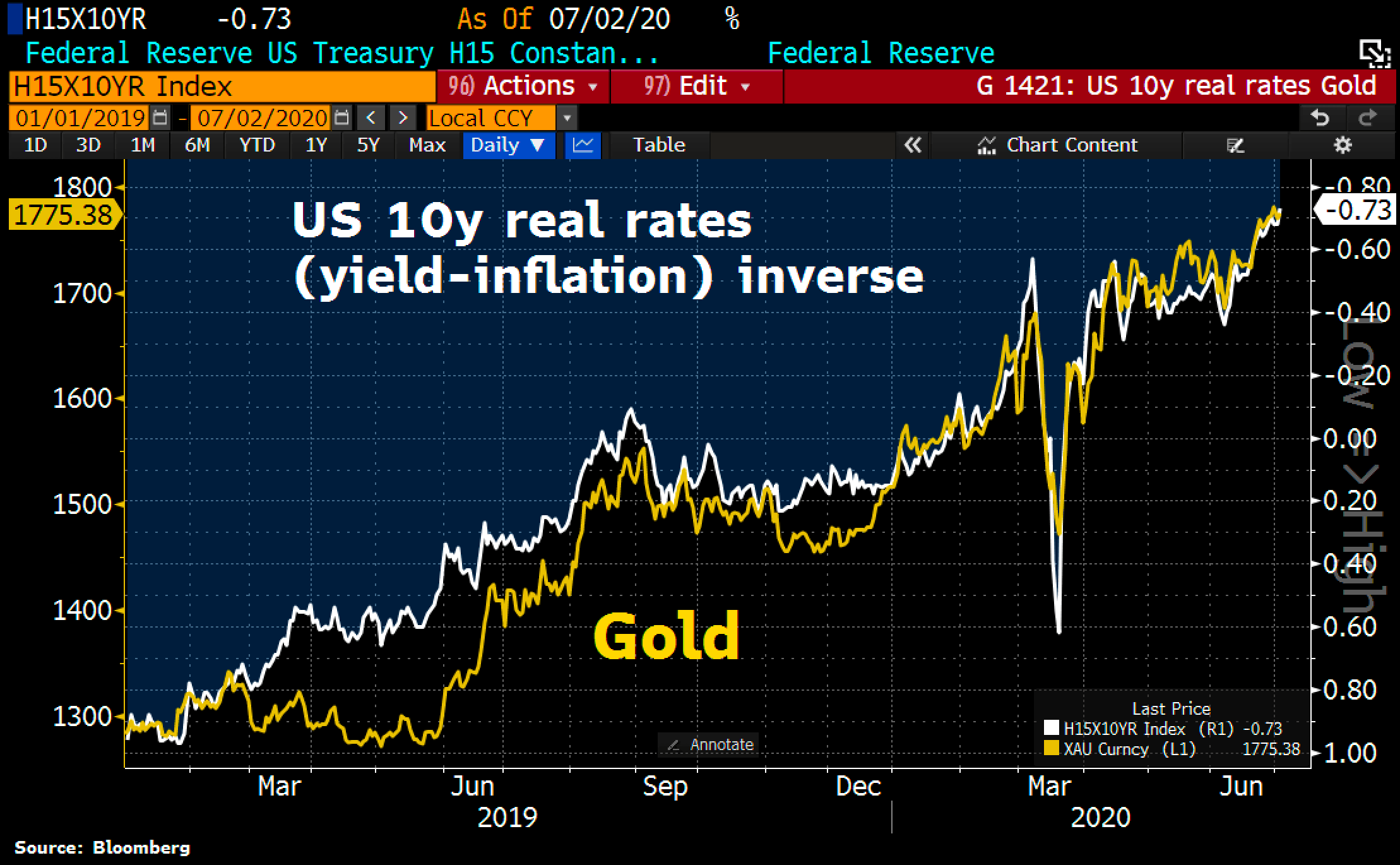در سه ماه گذشته طلا از 1450 دلار به 1789 دلار رسیده است و نرخ واقعی بازده ایالات متحده از 0.60 درصدبه منفی 073 درصد رسیده است. بازده منفی نشان دهنده کاهش قدرت خرید مردم و تورم می باشد و طلا همواره روش حفظ سرمایه در هنگام تورم می باشد. طبق پیش بینی ها طلا تا 12 ماه آینده می تواند به قیمت 2000 دلار برسد.