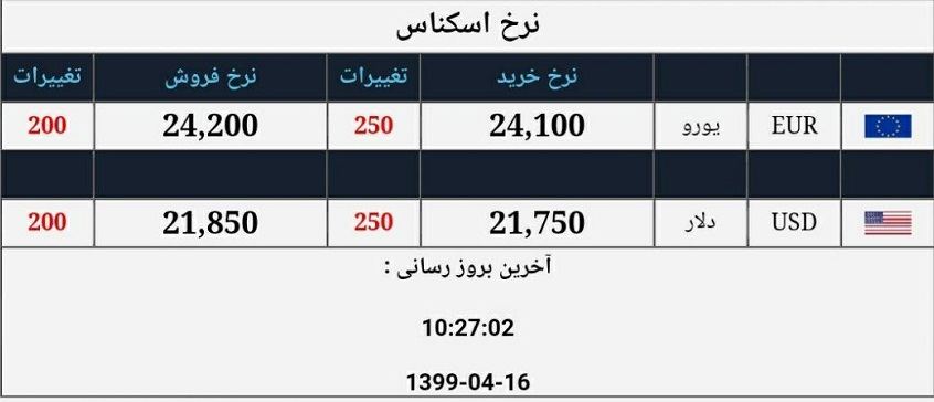 همچنین هر فرانک سوئیس ۴۴ هزار و ۵۲۳ ریال، کرون سوئد ۴ هزار و ۵۲۴ ریال، کرون نروژ ۴ هزار و ۴۵۰ ریال، کرون دانمارک ۶ هزار و ۳۵۹ ریال، روپیه هند ۵۶۴ ریال، درهم امارات متحده عربی ۱۱ هزار و ۴۳۷ ریال، دینار کویت ۱۳۶ هزار و ۴۱۳ ریال، یکصد روپیه پاکستان ۲۵ هزار و ۱۳۸ریال، یکصد ین ژاپن ۳۹ هزار و ۵ ریال، دلار هنگ کنگ ۵ هزار و ۴۲۰ ریال، ریال عمان ۱۰۹ هزار و ۲۳۳ ریال و دلار کانادا ۳۱ هزار و ۹ ریال قیمت خورد.