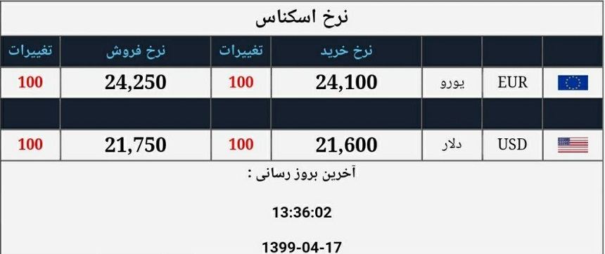 همچنین هر فرانک سوئیس ۴۴ هزار و ۵۵۸ ریال، کرون سوئد ۴ هزار و ۵۴۳ ریال، کرون نروژ ۴ هزار و ۴۶۹ ریال، کرون دانمارک ۶ هزار و ۳۷۵ ریال، روپیه هند ۵۶۳ ریال، درهم امارات متحده عربی ۱۱ هزار و ۴۳۷ ریال، دینار کویت ۱۳۶ هزار و ۴۵۴ ریال، یکصد روپیه پاکستان ۲۵ هزار و ۲۴۵ریال، یکصد ین ژاپن ۳۹ هزار و ۱۱۶ ریال، دلار هنگ کنگ ۵ هزار و ۴۲۰ ریال، ریال عمان ۱۰۹ هزار و ۲۳۳ ریال و دلار کانادا ۳۰ هزار و ۹۹۹ ریال قیمت خورد.