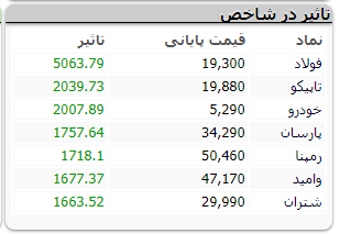 پتروشیمی مارون، سرمایه گذاری صبا تامین، پتروشیمی زاگرس، بیمه پاسارگاد، تولید نیروی برق دماوند، سنگ آهن گوهرزمین و بانک دی نسبت به سایر نمادها بیشترین تاثیر مثبت را در فرابورس گذاشتند و صنایع ذوبآهن اصفهان، بانک دی، سیمان لار سبزوار، گروه صنایع کاغذ پارس، گروه کارخانجات صنعتی تبرک، کشت و صنعت شهداب ناب خراسان و گروه سرمایه گذاری میراث فرهنگی نمادهای پربیننده این بازار بودند.