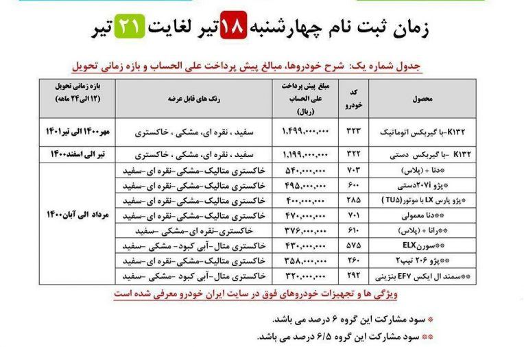 سود مشارکت در طرح برای محصول جدید، ۶ تا ۹ درصد و سایر محصولات ۶ تا ۶.۵ درصد و موعد تحویل همه خودروها از ۱۲ تا ۱۴ ماه درنظر گرفته شده که قیمت آن برمبنای قیمت مصوب روز تحویل، خواهد بود.