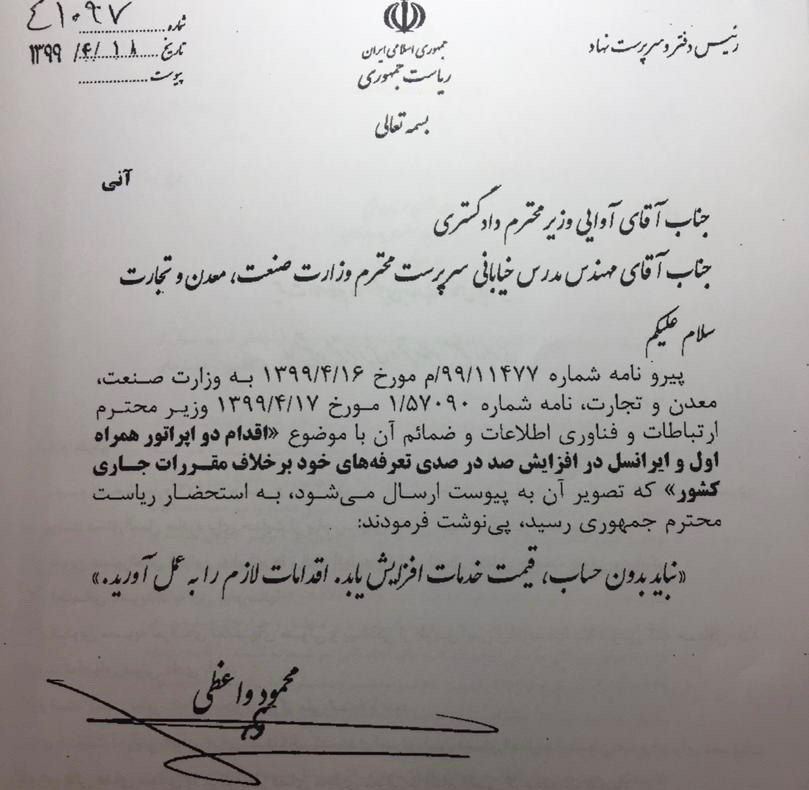 و بالاخره پس از بی توجهیهای مکرر به درخواستها در نامهای که متن آن رسیده است، محمود واعظی رئیس دفتر رئیسدفتر رئیس جمهور به وزرای دادگستری و صمت، به نقل از حسن روحانی برای برخورد قانونی با گرانفروشی همراه اول و ایرانسل اولتیماتوم داده است. در متن نامه آمده است که نباید بدون حساب، قیمت خدمات افزایش یابد. اقدامات لازم را به عمل آورید.