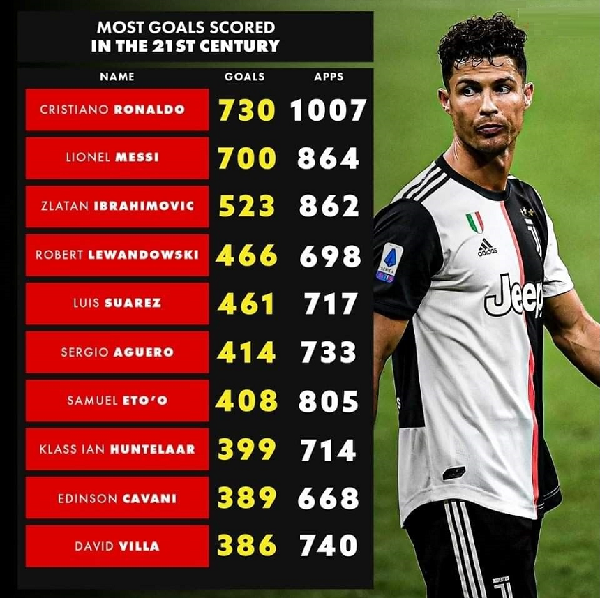 در فهرستی 10 گلزن برتر قرن 21 که انتشار یافت، وی در رده نخست جای گرفت. در رده دوم این فهرست لیونل مسی، فوق ستاره آرژانتینی با 700 گل زده در 864 بازی جای گرفت. رده سوم نیز در اختیار زلاتان ابراهیموویچ با 523 گل زده در 862 بازی قرار گرفت.