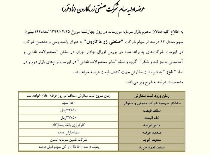 بر این اساس، آگهی عرضه اولیه سهام شرکت "صنعتی زر ماکارون" به نماد «غزر» منتشر شد که مطابق آن روز چهارشنبه (٢٥ تیر ماه) تعداد ۱۹۲ میلیون سهم معادل ۱۲ درصد از سهام شرکت "صنعتی زر ماکارون" به عنوان پانصدوسی و هشتمین شرکت در فهرست شرکت های پذیرفته شده در بورس اوراق بهادار تهران در بخش "محصولات غذایی و آشامیدنی به جز قند و شکر" گروه و طبقه "سایر محصولات غذائی" در فهرست نرخهای بازار دوم و در نماد " غزر " به شیوه ثبت سفارش جهت کشف قیمت عرضه خواهد شد.