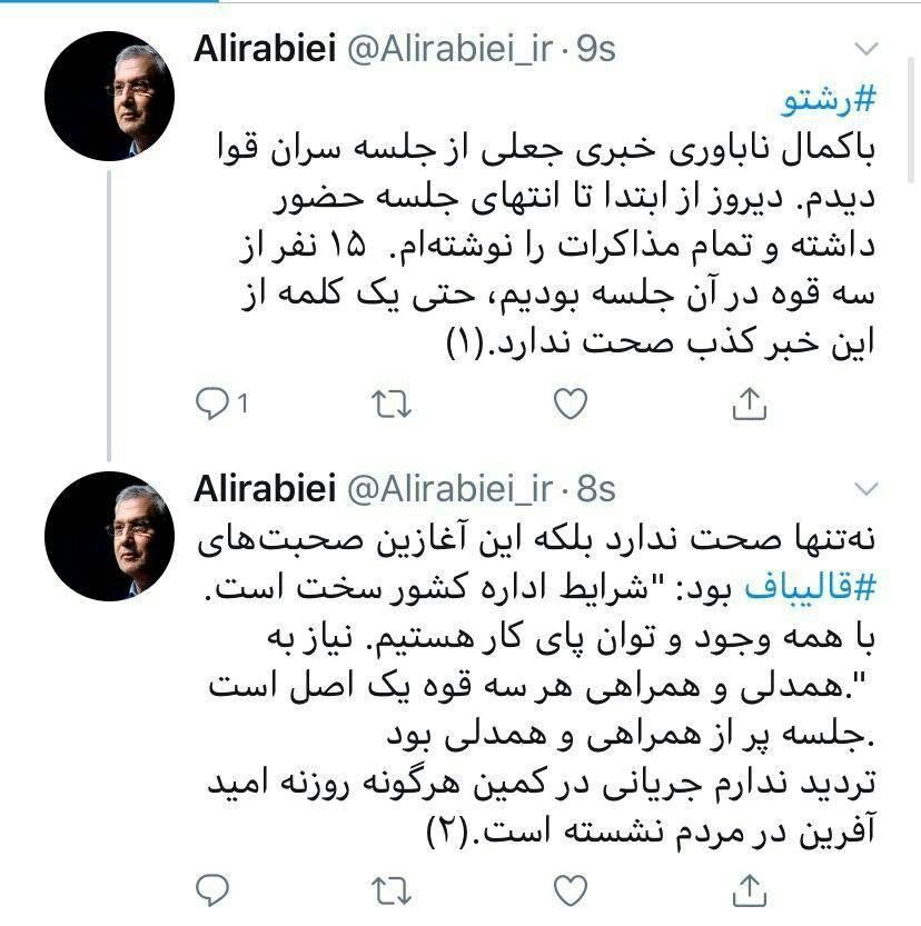 علی ربیعی سخنگوی دولت با تکذیب این خبر در توئیتی نوشت: با کمال ناباوری خبری جعلی از جلسه سران قوا دیدم. دیروز از ابتدا تا انتهای جلسه حضور داشته و تمام مذاکرات را نوشته ام.۱۵ نفر از سه قوه در آن جلسه بودیم حتی یک کلمه از این خبر کذب صحت ندارد. نه تنها صحت ندارد بلکه این آغازین صحبتهای قالیباف بود: شرایط اداره کشور سخت است. با همه وجود و توان پای کار هستیم. نیاز به همدلی و همراهی هر سه قوه یک اصل است. جلسه پر از همراهی و همدلی بود. تردید ندارم جریانی در کمین هرگونه روزنه امید آفرین در مردم نشسته است.
