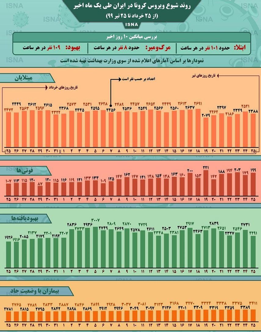اینفوگرافیک/ روند کرونا در ایران، از ۲۵ خرداد تا ۲۵ تیر