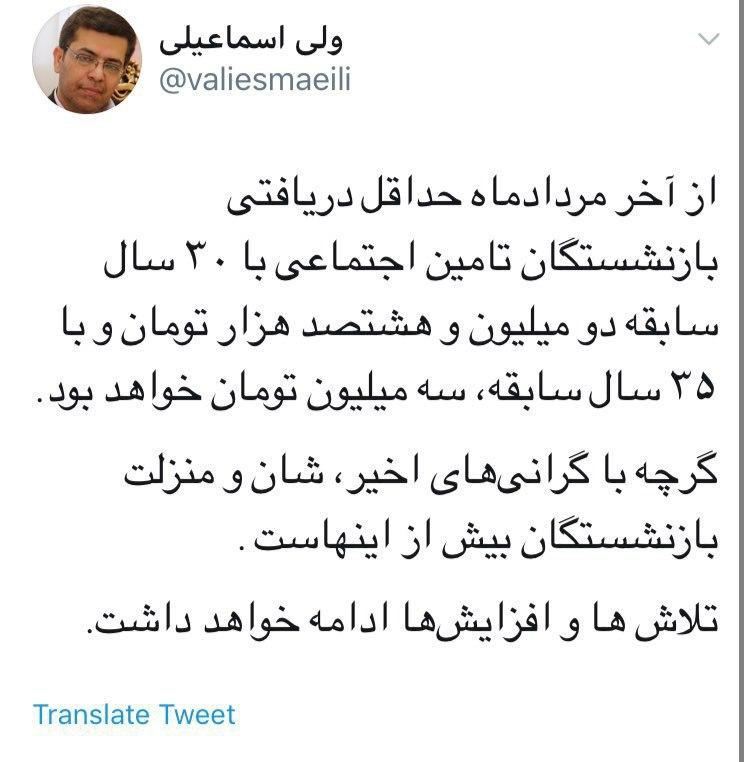 ولی اسماعیلی در صفحه رسمی توییتر خود نوشت: «از آخر مرداد ماه حداقل دریافتی بازنشستگان تامین اجتماعی با ۳۰ سال سابقه دو میلیون و هشتصد هزار تومان و با ۳۵ سال سابقه، سه میلیون تومان خواهد بود. گرچه با گرانیهای اخیر، شأن و منزلت بازنشستگان بیش از اینهاست. تلاشها و افزایشها ادامه خواهد داشت.»