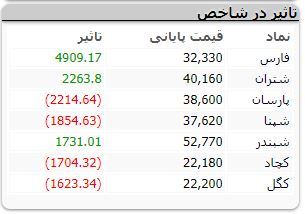 امروز نمادهای پتروشیمی خلیج فارس و پالایش نفت تهران و نیز پالایش نفت بندرعباس بیشتری اثر تقویتی در شاخص کل بورس را داشته و نمادهای گسترش نفت و گاز پارسیان، پالایش نفت اصفهان، چادرملو و گل گهر بیشترین اثر کاهشی در شاخص کل بورس را داشتند.