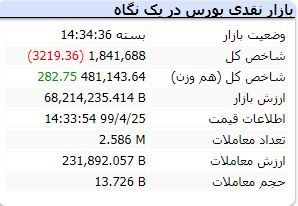 معاملهگران امروز در بورس اوراق بهادار تهران حدود 14 میلیون برگه سهام، حق تقدم و یا اوراق مالی در قالب 2.6 میلیون نوبت معامله و به ارزش 23 هزار و 287 میلیارد تومان داد و ستد کردند.