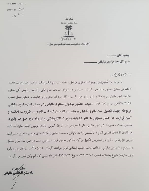 در این نامه آمده است: با توجه به الکترونیکی و هوشمندسازی مراحل سامانه ثبت نام الکترونیک و ضرورت رعایت فاصله اجتماعی مطابق دستور ستاد ملی کرونا و همچنین در اجرای منویات مقام عالی وزارت و رئیس کل محترم سازمان امور مالیاتی و به منظور تسهیل در امور کسب و کار مودیان محترم و با عنایت به دستورالعمل شماره ۲۷۰۳۱۵۹/ص مورخ ۱۳۹۹/۳/۷، منبعد حضور مودیان محترم مالیاتی در محل اداره امور مالیاتی مربوطه جهت تکمیل ثبت نام و تشکیل پرونده ، ارائه مدارک ثبت نام و... ضرورت نداشته و کلیه فرآیند ها اعتبار سنجی تا گام 45 باید بصورت الکترونیکی و از راه دور صورت پذیرد.