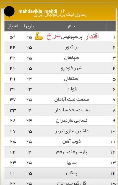 مهدی مهدویکیا، پیشکسوت باشگاه پرسپولیس تصویری از جدول رده بندی و فاصله سرخپوشان با دیگر تیمها را در فضای مجاز منتشر کرد و برای سایر تیمها کُری خواند.