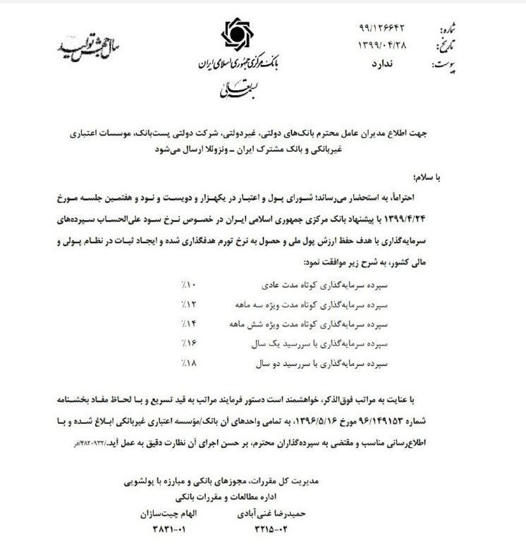ابلاغ نرخ های جدید سود بانکی/ سود سپرده ۲ ساله ۱۸ درصد شد + سند