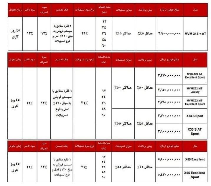 طرح جدید فروش محصولات ام وی ام شرکت مدیران خودرو ویژه مردادماه ۹۹ منتشر شد. در طرح ارائه شده، محصولات با تحویل ۴۵ روز کاری آماده تحویل به متقاضیان میباشند.