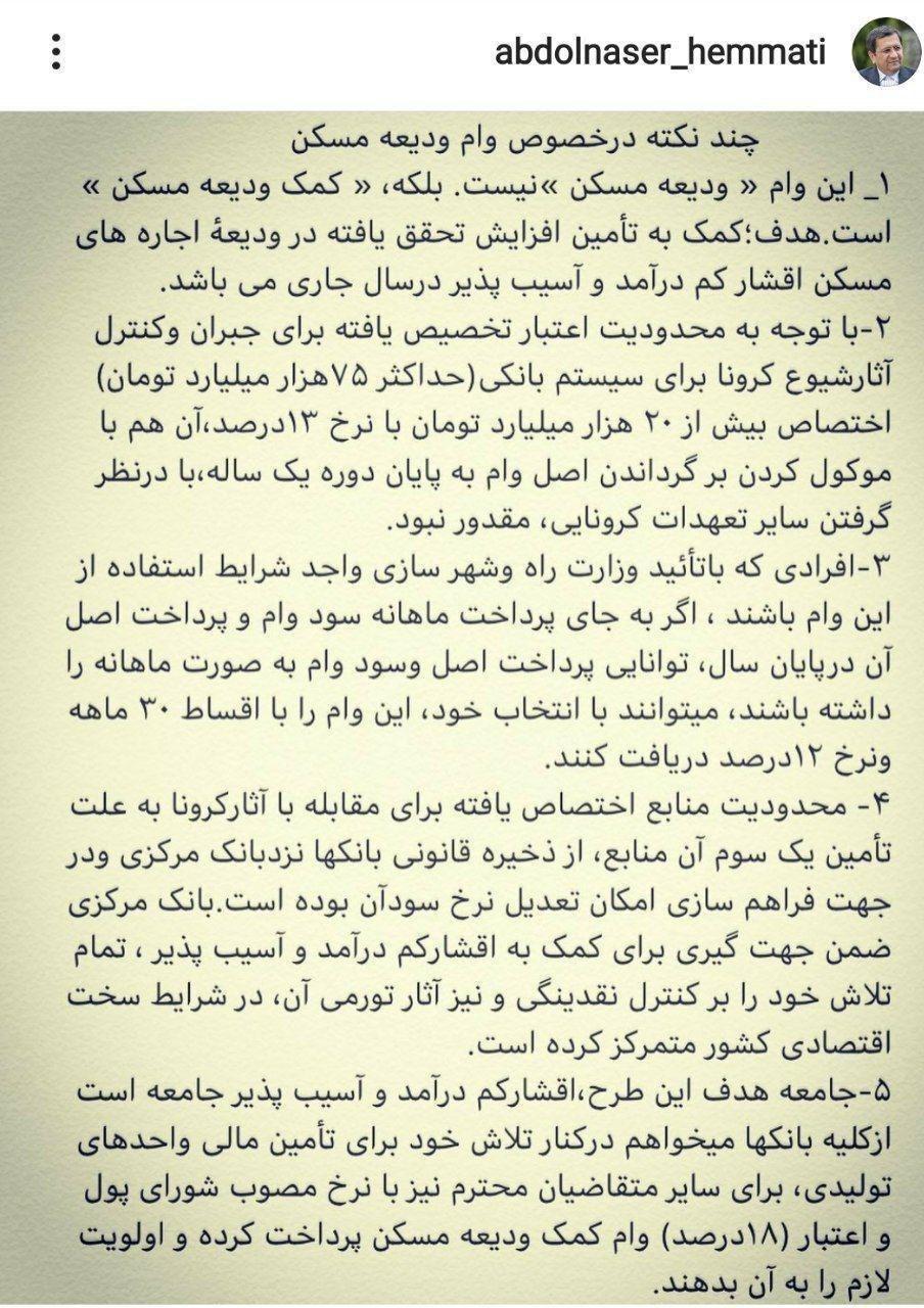 به گزارش سایت طلا ،عبدالناصر همتی رئیس کل بانک مرکزی در صفحه اینستاگرام خود درباره کمک ودیعه مسکن نوشت: