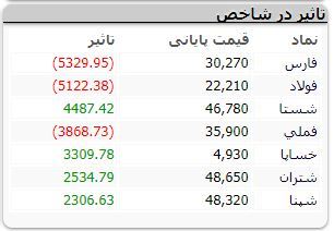 نماد سنگ آهن گهرزمین (کگهر)، سرمایه گذاری صبا تامین (صبا)، پتروشیمی زاگرس (زاگرس)، فولاد هرمزگان جنوب (هرمز)، شرکت آهن و فولاد ارفع (ارفع)، پالایش نفت لاوان (شاوان)، توسعه مولد نیروگاهی جهرم (بجهرم)، بیمه پاسارگاد (بپاس)، اعتباری ملل (وملل) و پالایش نفت شیراز (شراز) تاثیر منفی بر شاخص این بازار همراه بودند.